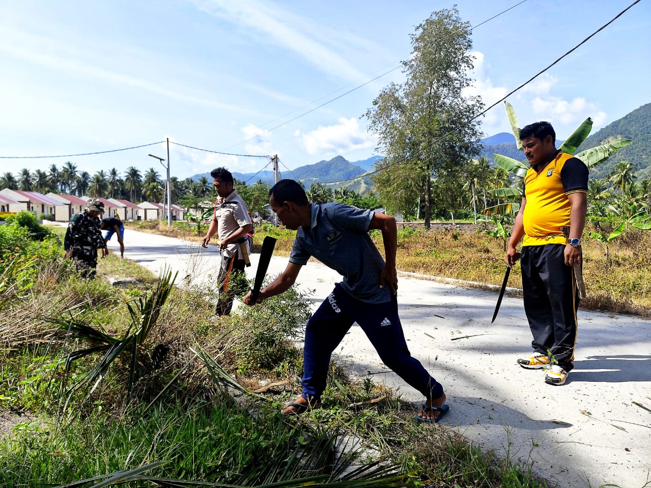 Fokus kegiatan meliputi pembersihan rumput liar, sampah di bahu jalan, serta perapian lingkungan sekitar lokasi Huntap.