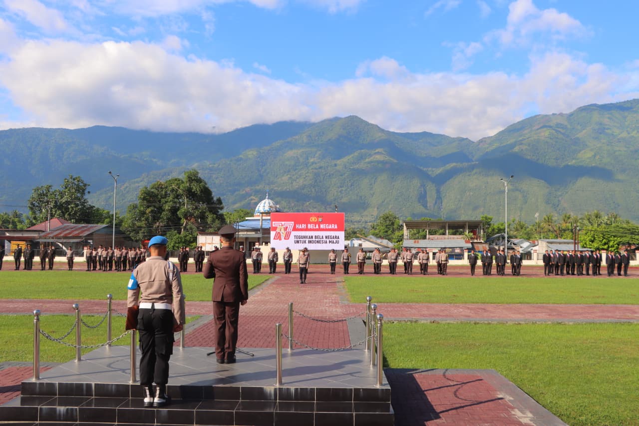 Upacara peringatan Hari Bela Negara ke-77 di Polres Sigi berlangsung dengan khidmat, tertib, dan penuh semangat nasionalisme. (Humas Polres Sigi)
