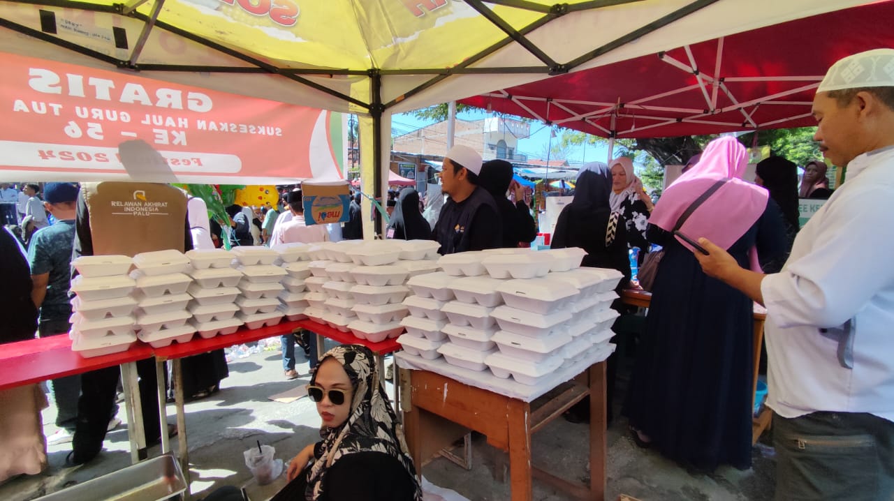 PALU, PENASULAWESI.com – Sejumlah relawan yang tergabung dalam Kolaborasi Relawan Kota Palu, menyiapkan nasi kotak siap saji dan aneka minuman panas dan dingin di Haul Guru Tua ke 56, Minggu (21/4/2024).