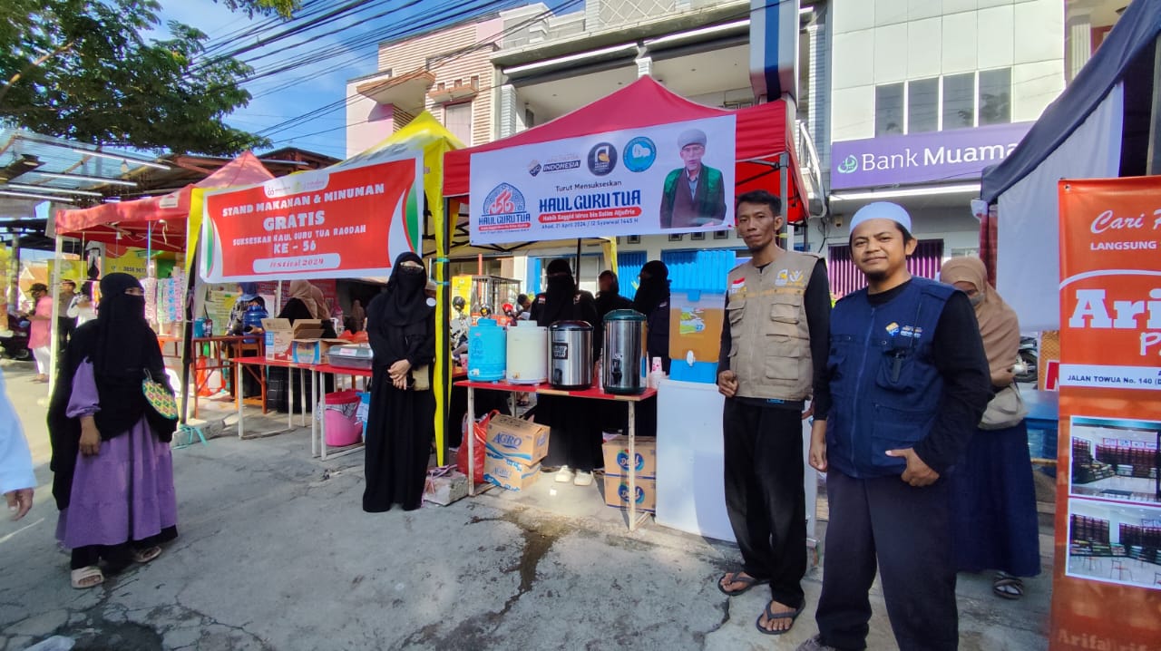 “Alhamdulillah hari ini di puncak Haul Guru Tua ke 56 kami dari sejumlah komunitas berkolaborasi menyiapkan nasi dos dan aneka minuman secara gratis kepada para tamu-tamu undangan yang datang ke Haul Guru Tua ke 56,” ujar Ummu Farhat.