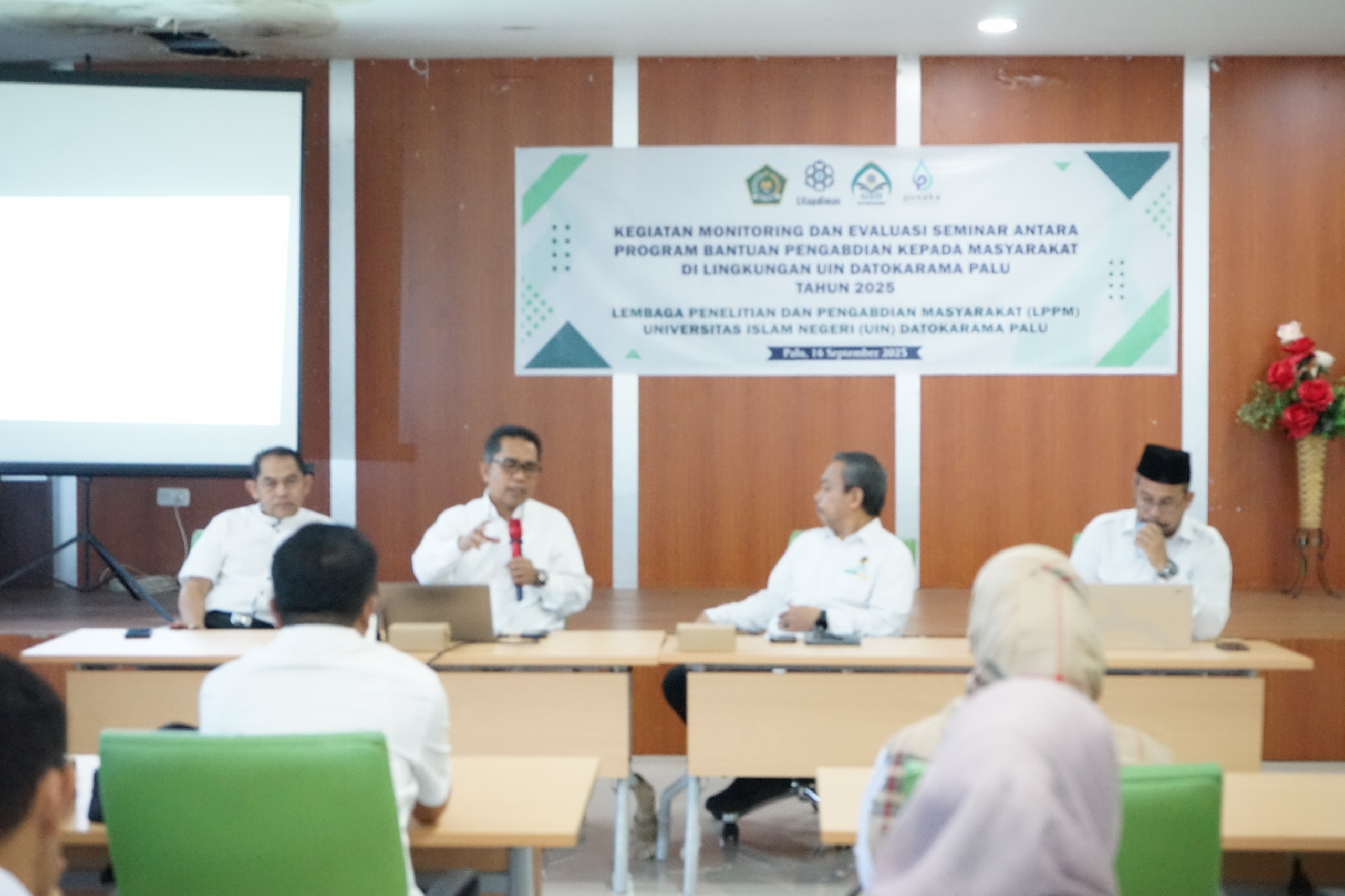 LPPM UIN Datokarama melaksanakan monitoring dan evaluasi seminar antara program bantuan pengabdian kepada masyarakat Tahun 2025. Monev dihadiri oleh Wakil Rektor Bidang Akademik Doktor Hamka, pimpinan LPPM, serta para peneliti.