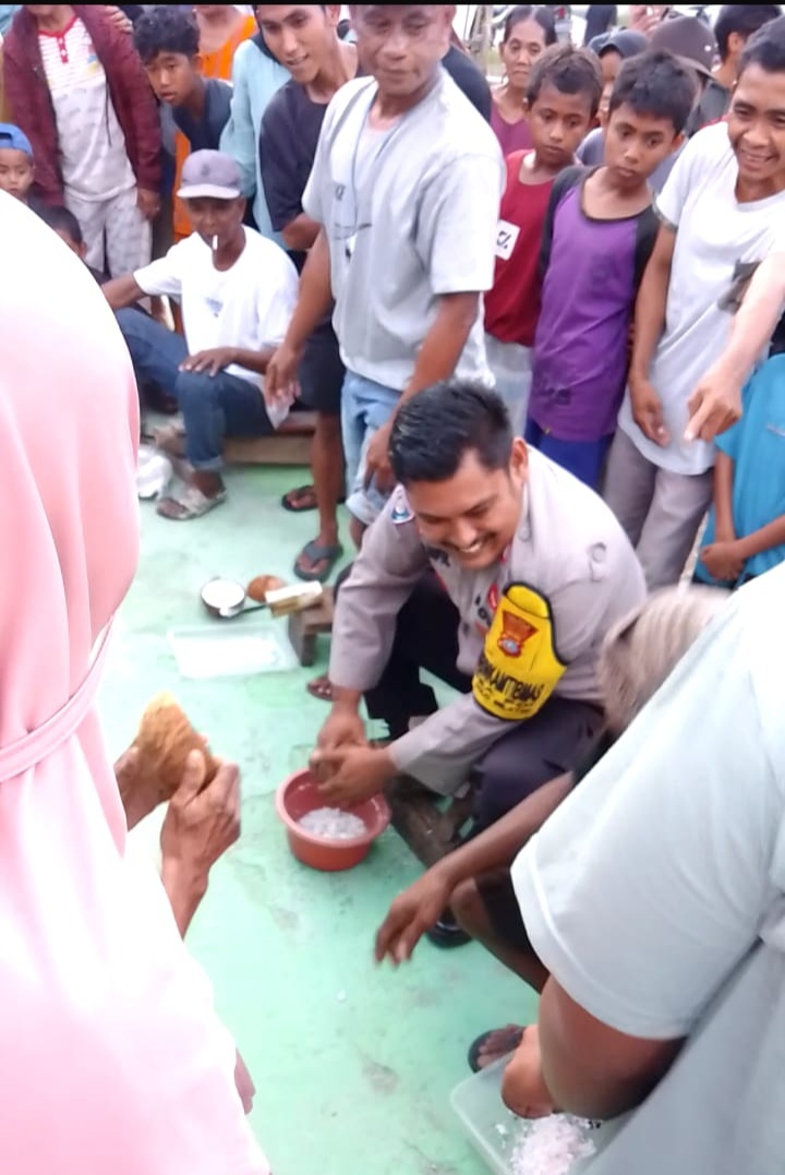 Uniknya Brigadir Sahfil serta para bapak-bapak lainnya mampu menunjukkan ketangkasannya mengukur kelapa dengan alat tradisional.