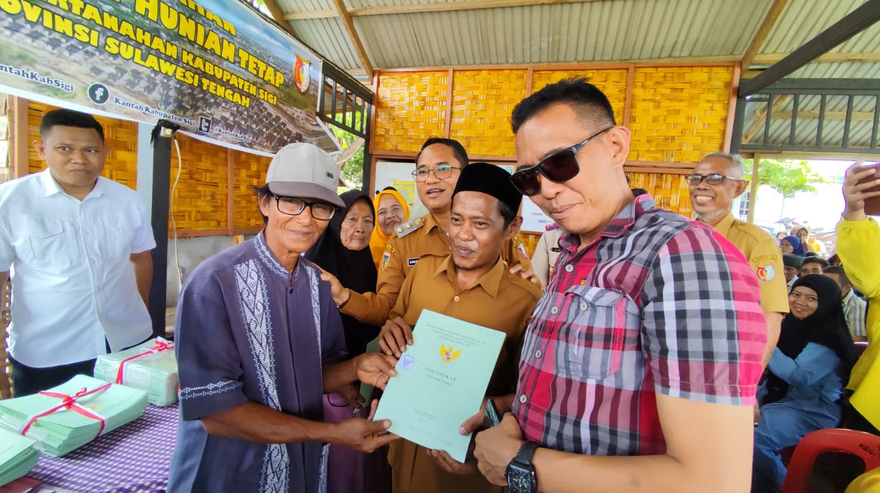 Sertifikat gratis tersebut diserahkan langsung oleh Wakil Bupati Sigi DR Samuel Yansen Pongi dan Kepala BPN Kabupaten Sigi, Juwahir, kepada masyarakat penerima Huntap desa Poi, di Kantor Camat Tanambulaba, Senin (13/5/2024).