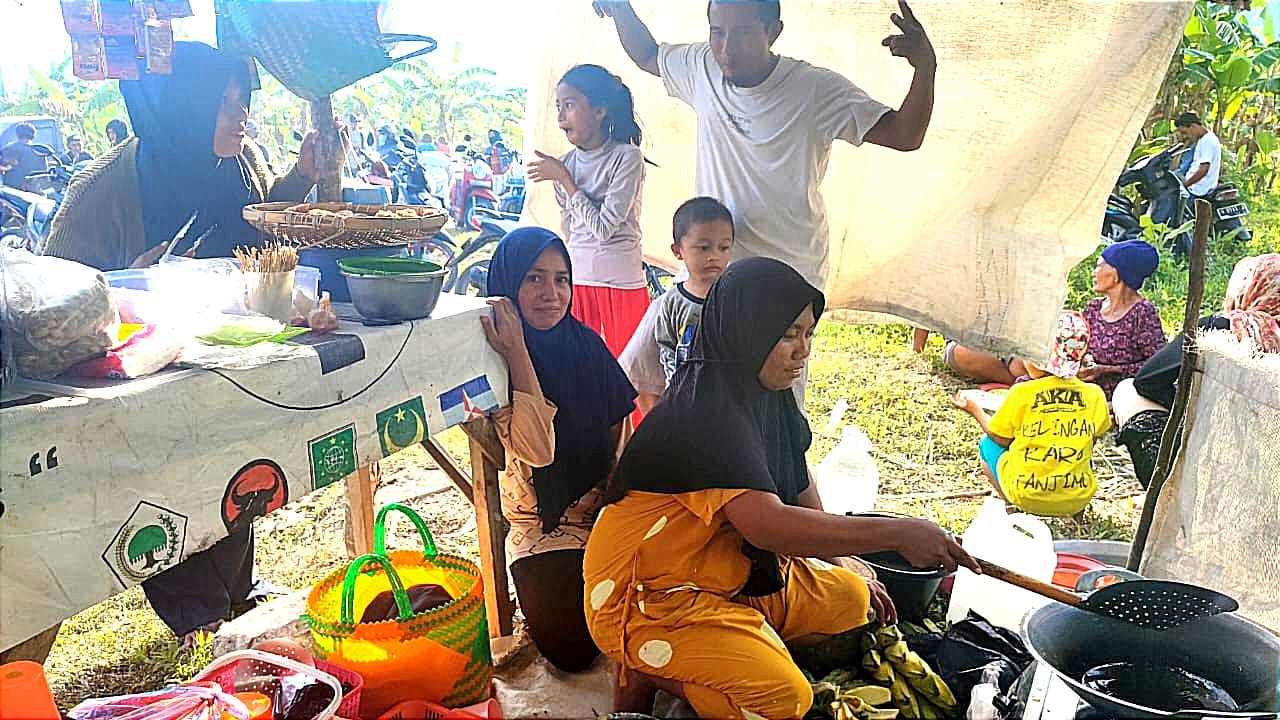 Tak ketinggalan pula bagi sejumlah warga yang ada di desa itu. Momen seperti itu tak mereka sia-siakan. Berbagai jajanan ringan di siapkan di lokasi itu. Seperti pisang goreng, somai dan camilan lainnya.